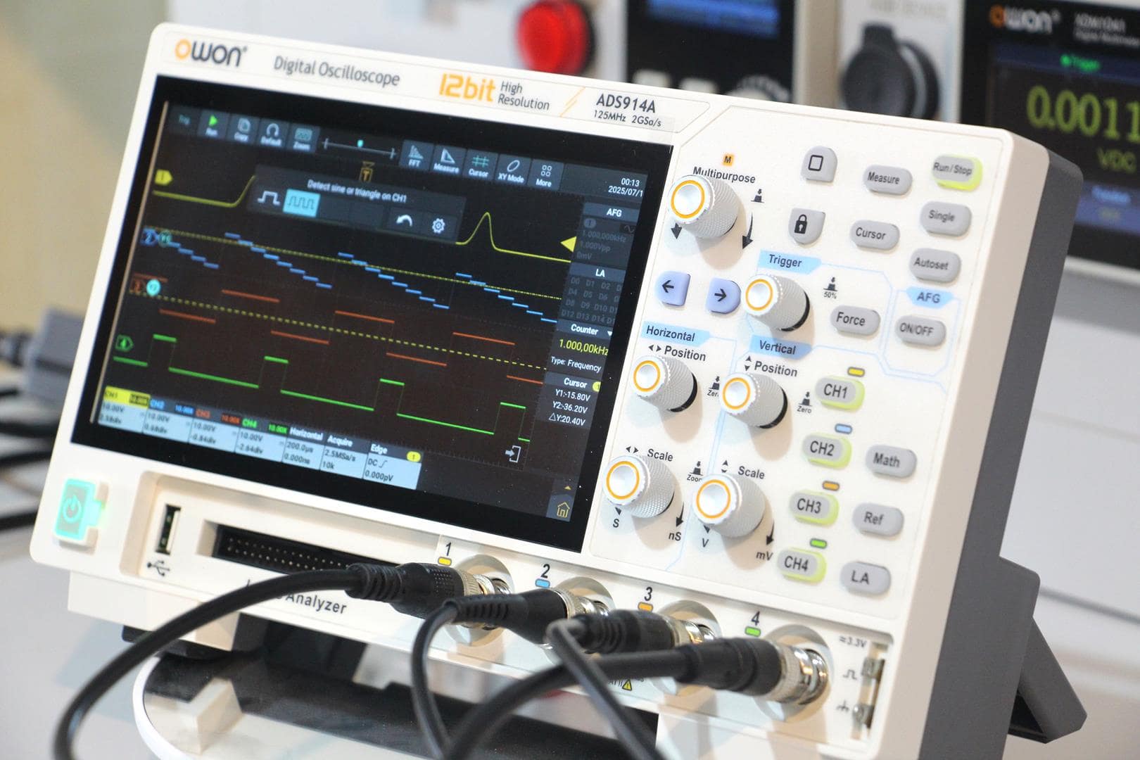 The OWON ADS914A is a powerful and compact 4-channel oscilloscope with 125 MHz bandwidth and 12-bit vertical resolution, ideal for laboratory, R&D, and professional test environments. It integrates oscilloscope, spectrum analyzer, digital multimeter, arbitrary waveform generator (AFG), and logic analyzer functions into one advanced system. Powered by the X-Vision III architecture, it offers higher speed, larger memory, and lower noise performance.